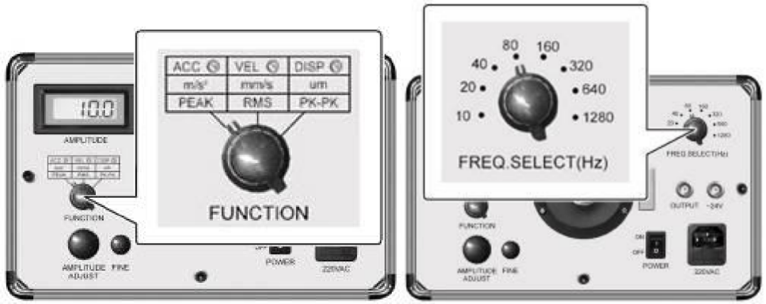 Note: With higher frequency the value of the displacement of vibration is very small so there will be no vibration signal output from the calibrator.